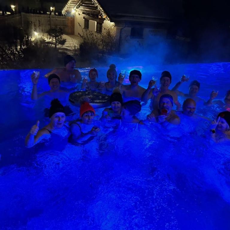Zum Après Ski trafen sich alle im Hotel Pool-mit Crémant und Poolmütze, rein zum Entspannen, versteht sich.