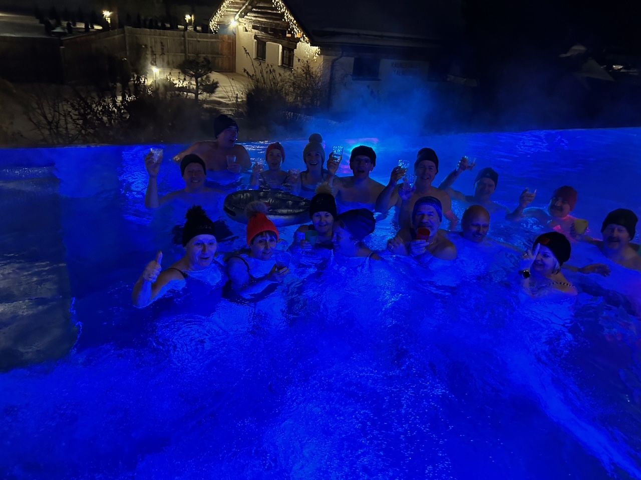 Zum Après Ski trafen sich alle im Hotel Pool-mit Crémant und Poolmütze, rein zum Entspannen, versteht sich.